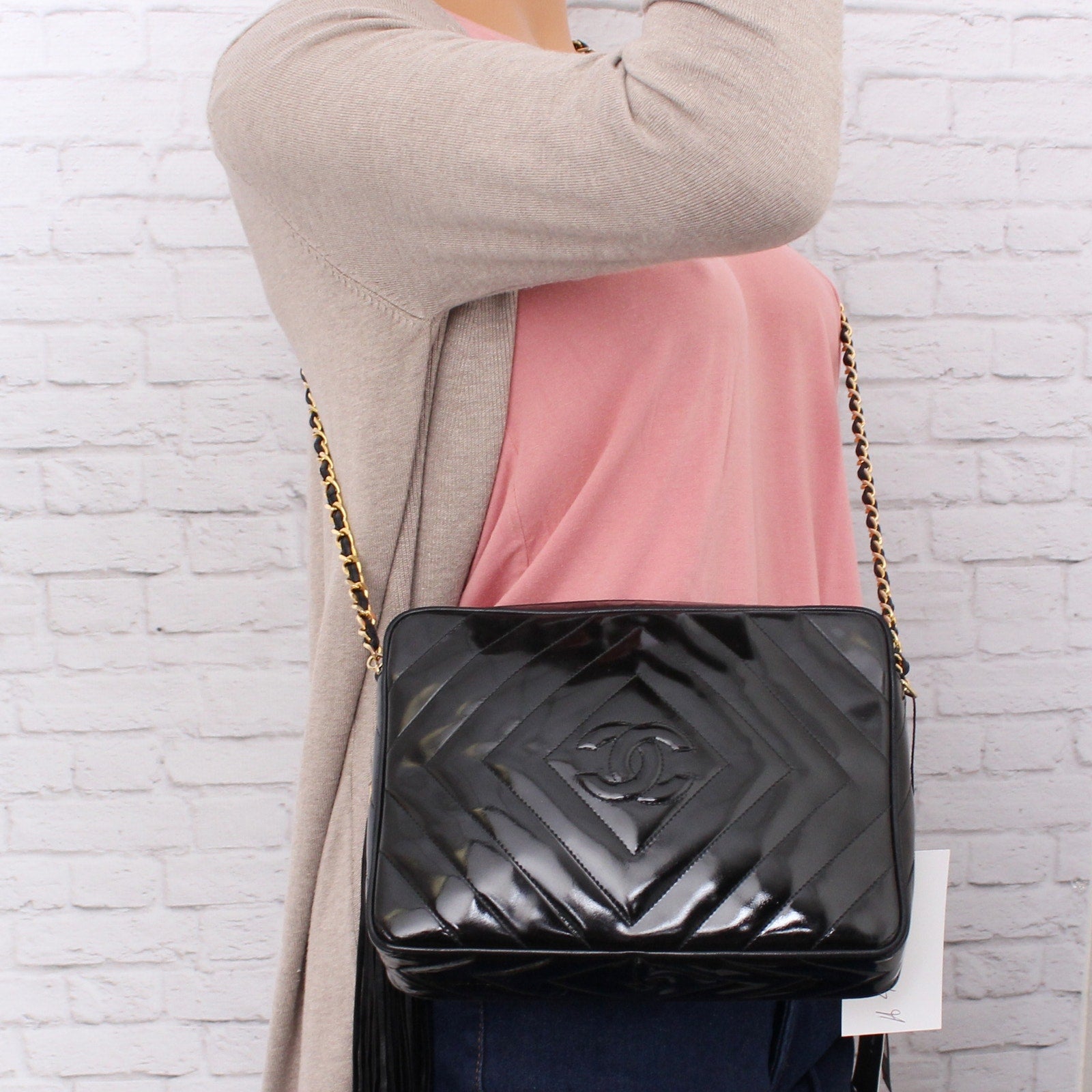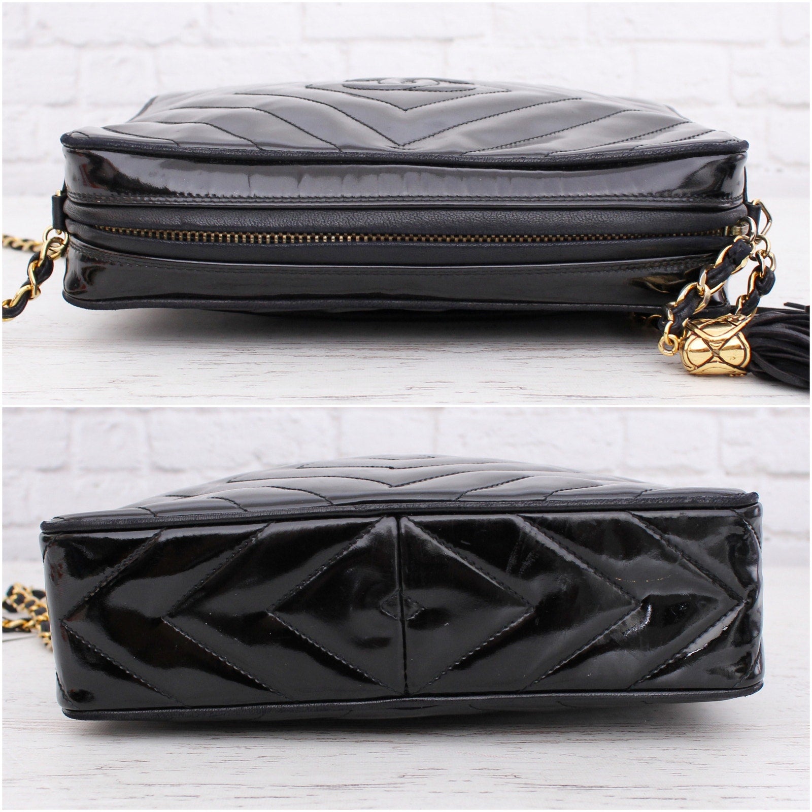 Chanel CC Diamond Quilted Camera Bag Black Patent Leather Shoulder and Crossbody Camera Bag