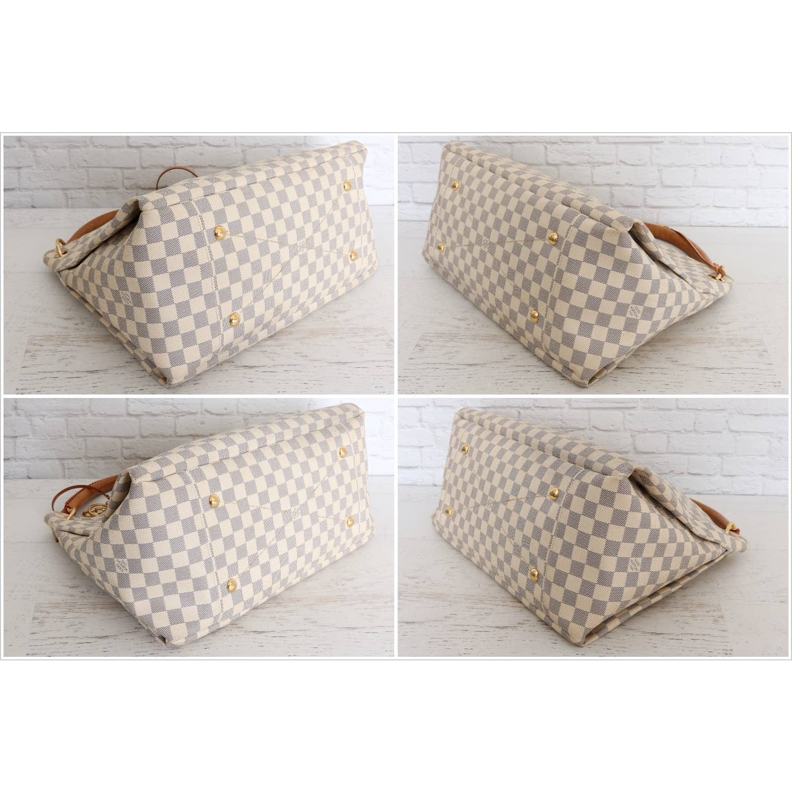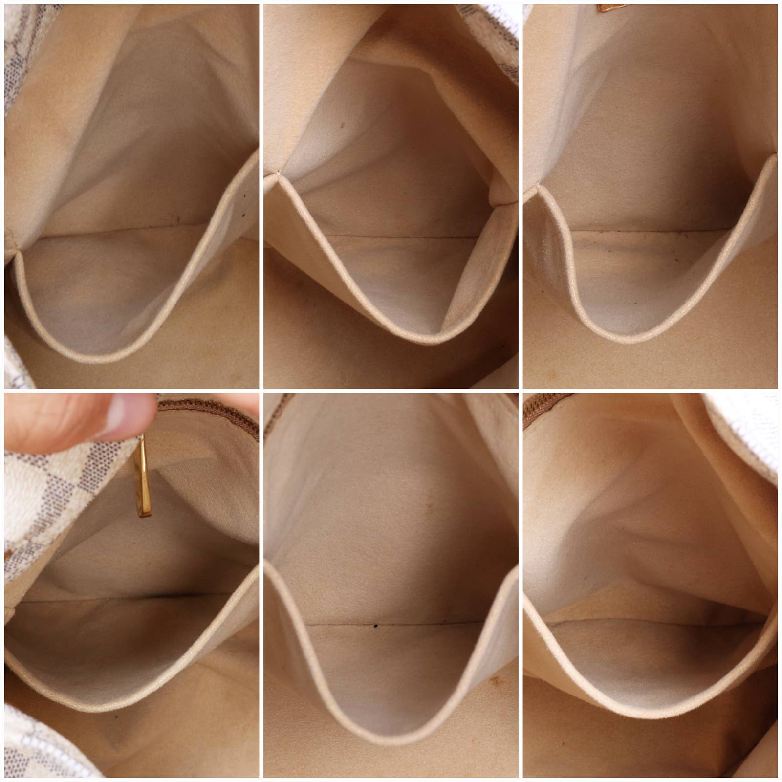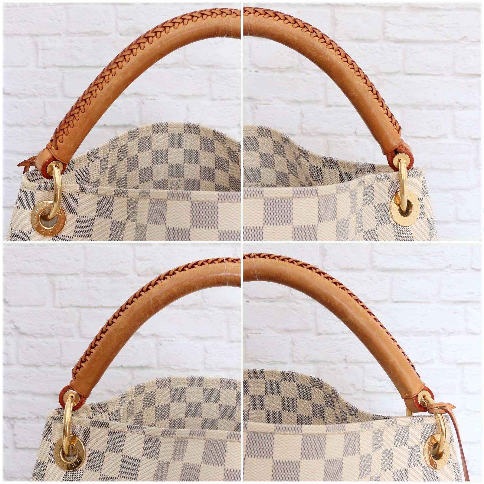 Vachetta (handles & trim): Overall tanning with some darkening, marks, and scuffs.