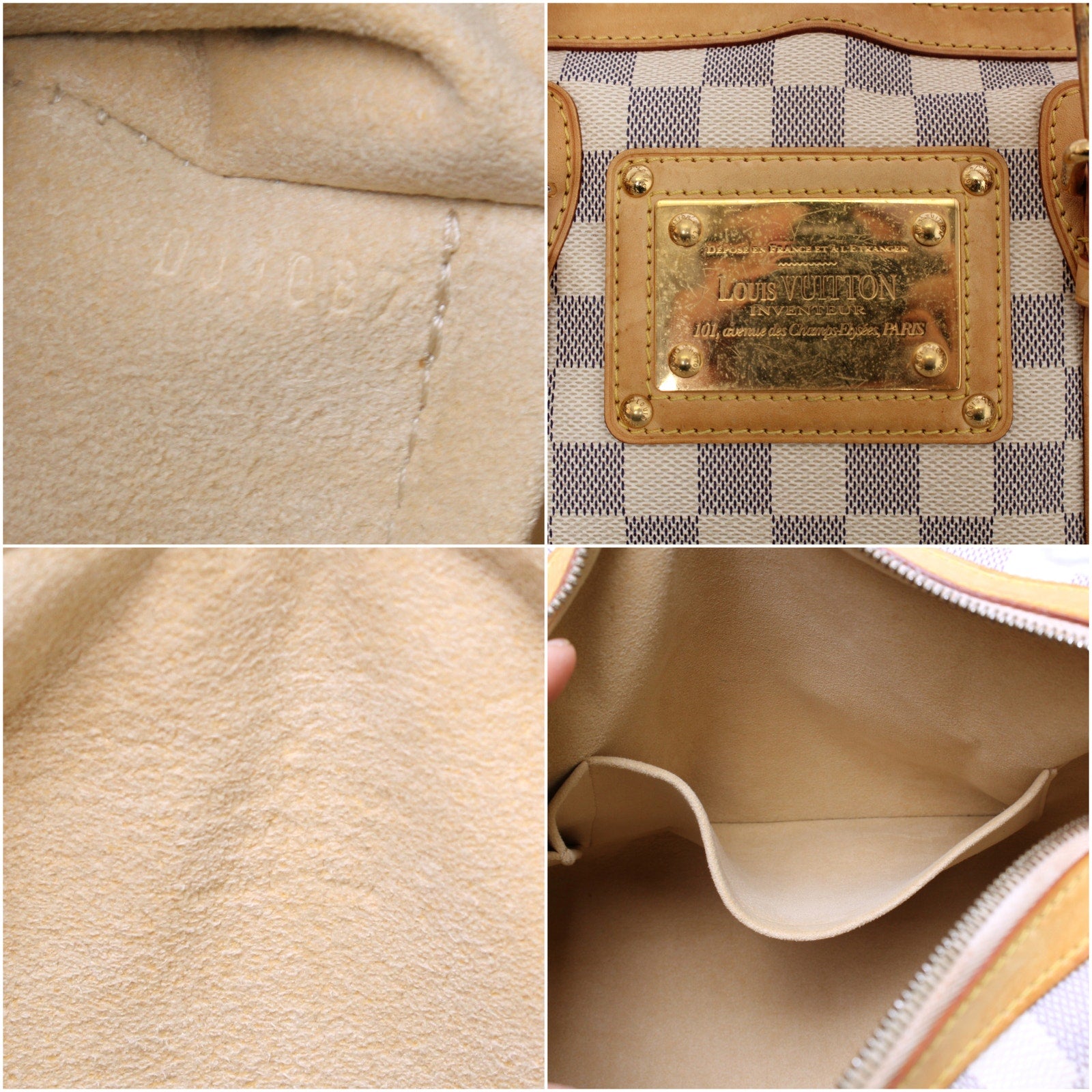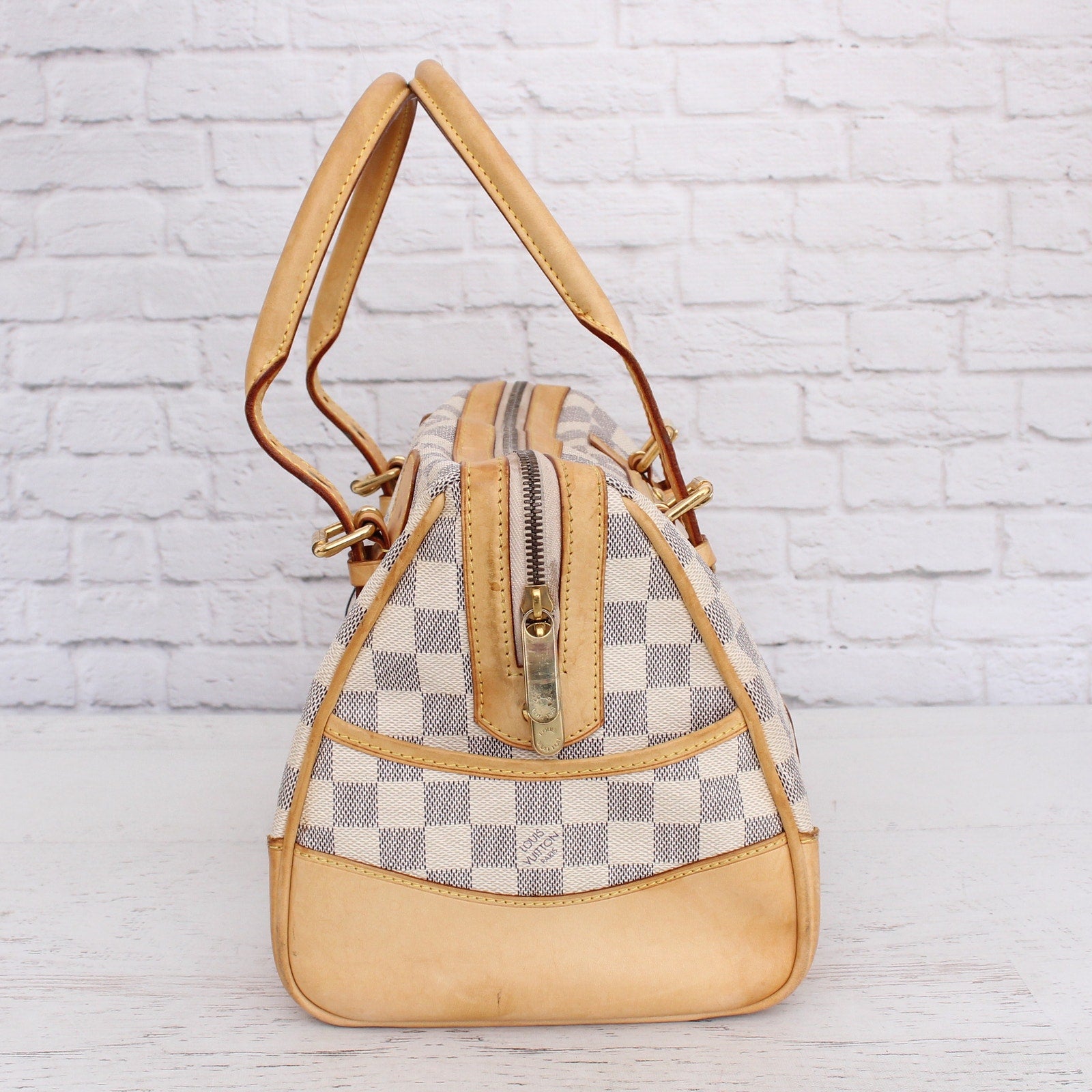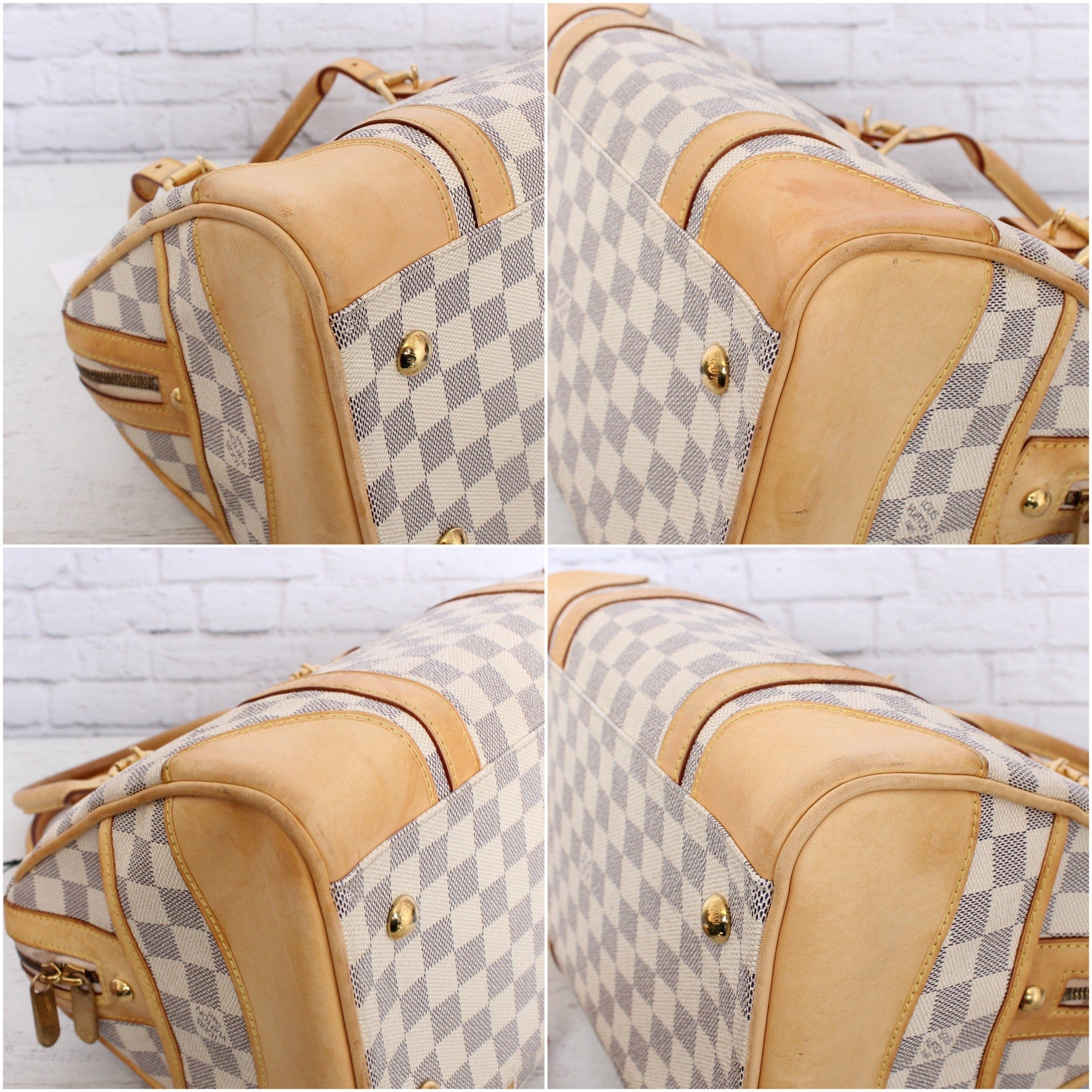 Vachetta (handles & trim): Overall tanning with areas of wrinkling, darkening, rubbing.