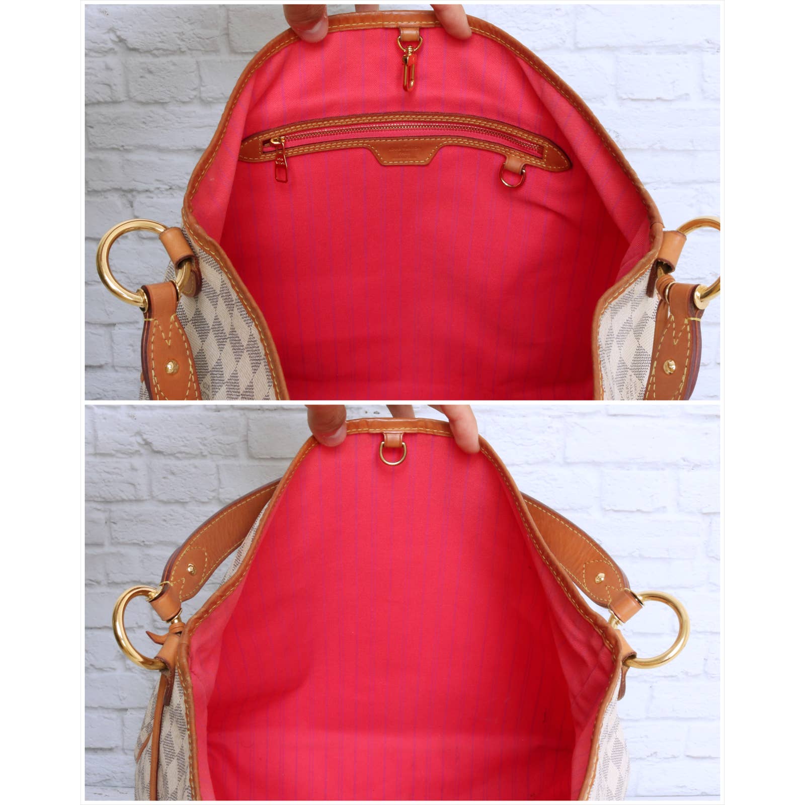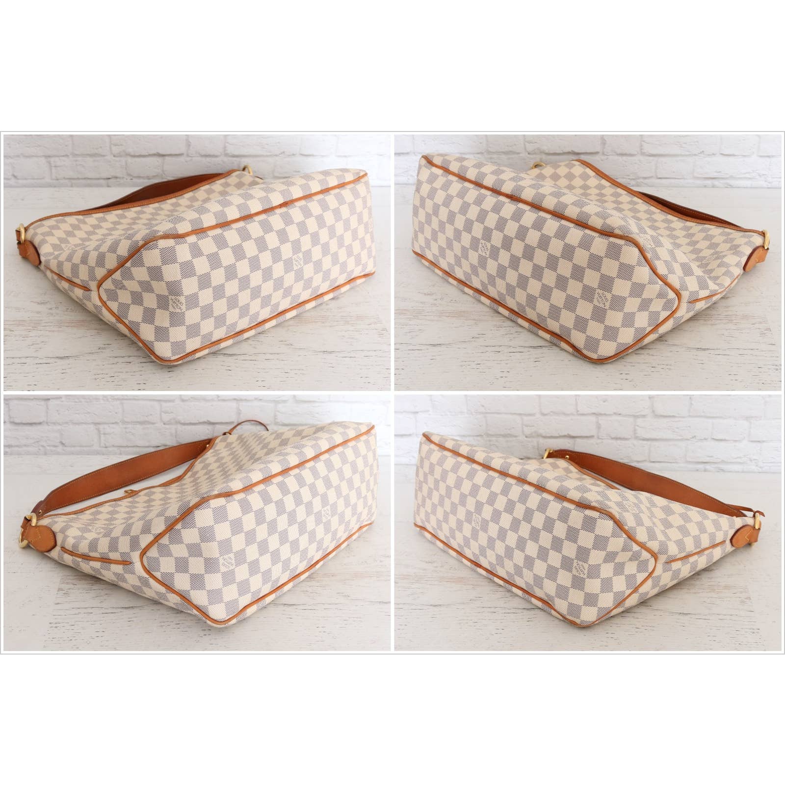 Vachetta (handles & trim): Overall tanning with some scuffs/fading and wrinking. Trim has some rubbing/fading on the corners