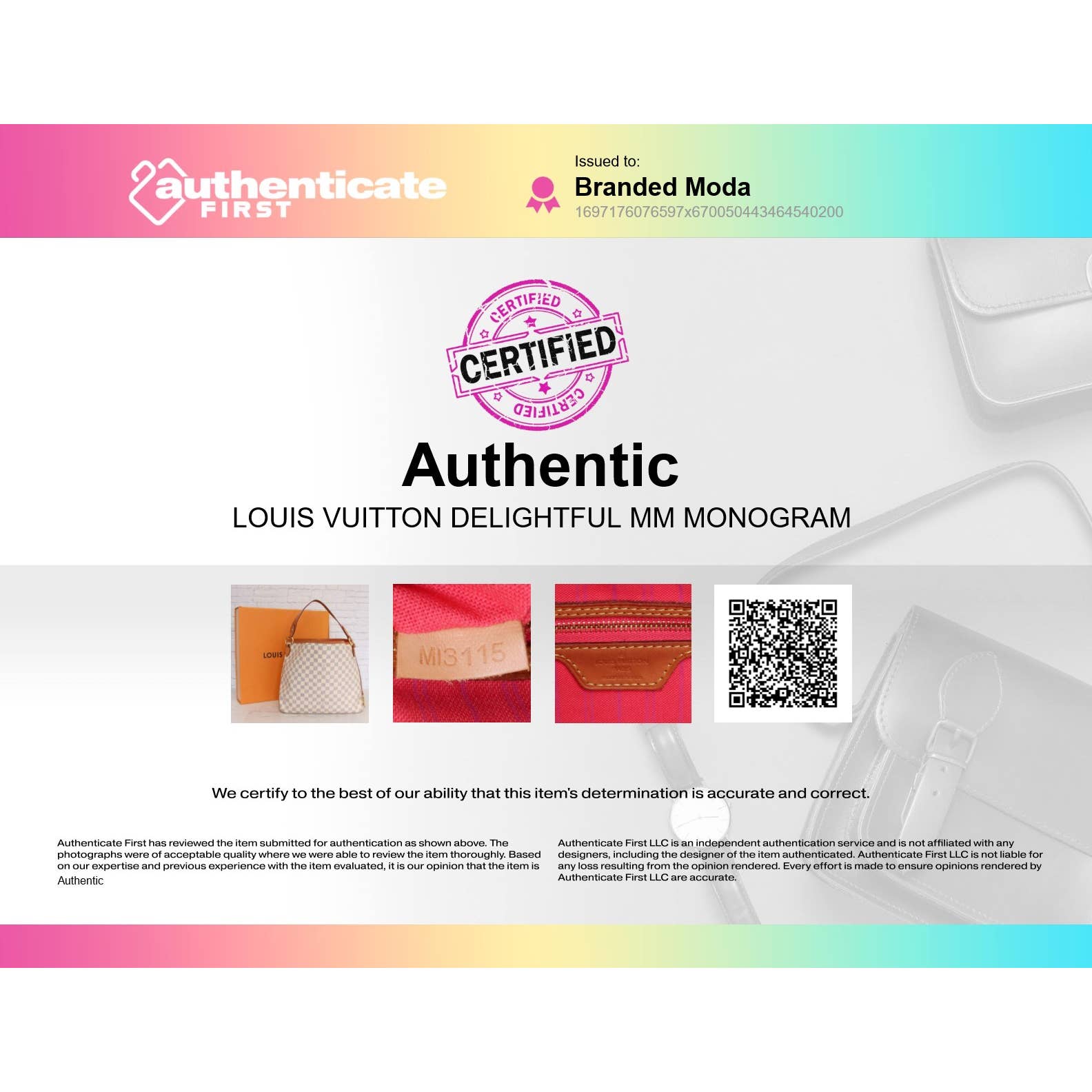 100% Authentic backed with our money back guarantee. Includes authentication by AuthenticateFirst, the leading Louis Vuitton authenticator (please see second image for Certificate of Authenticity and scan QR code to view authentication).
