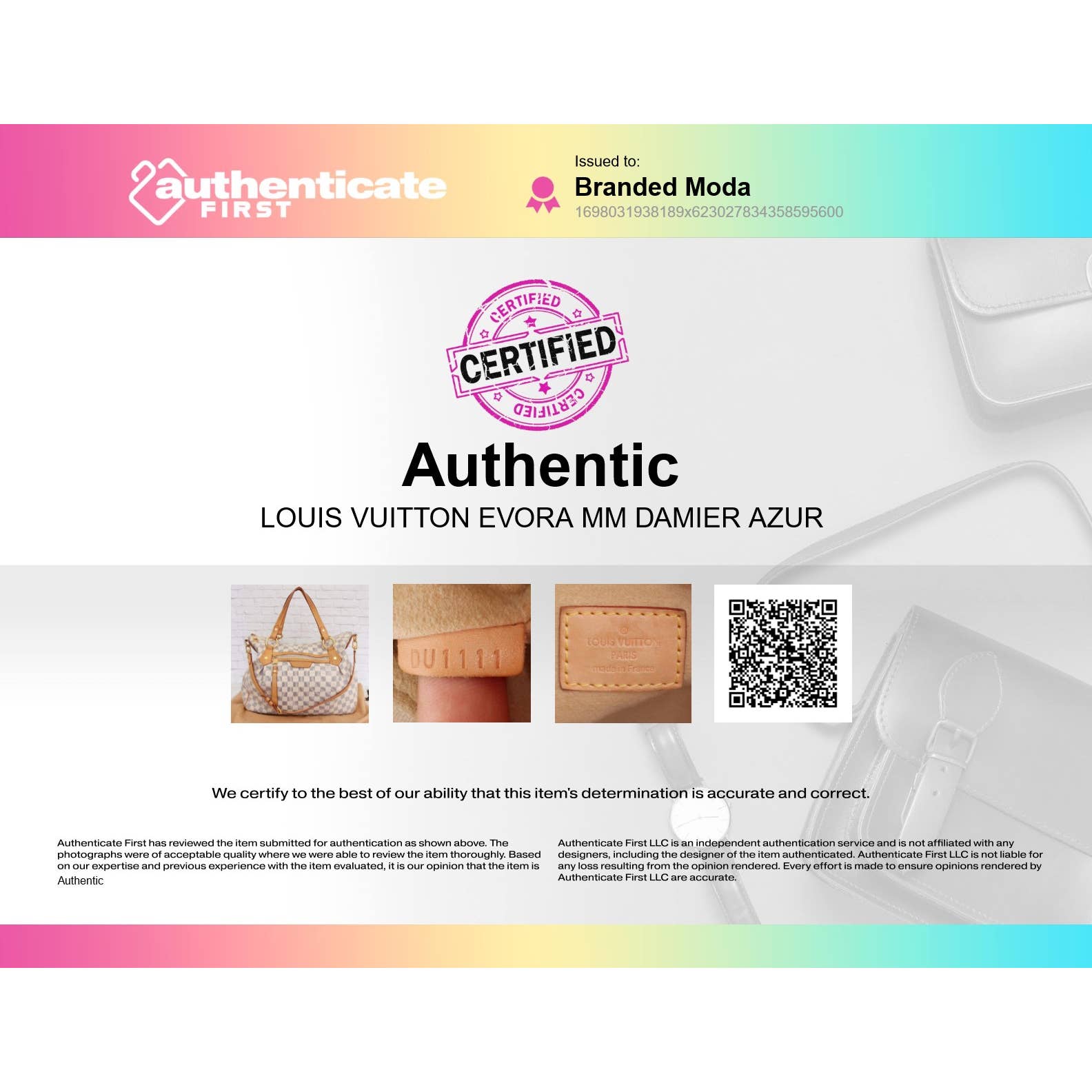 100% Authentic backed with our money back guarantee. Includes authentication by AuthenticateFirst, the leading Louis Vuitton authenticator (please see second image for Certificate of Authenticity and scan QR code to view authentication).