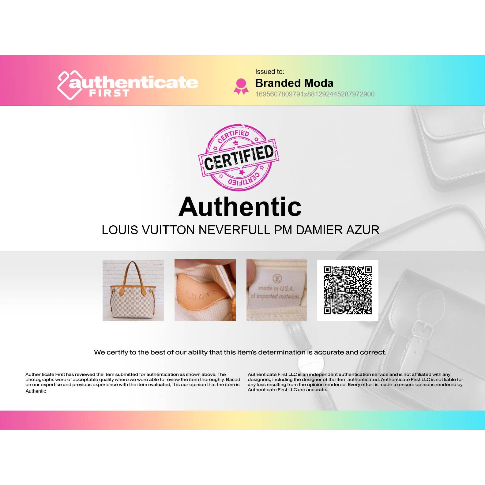 100% Authentic backed with our money back guarantee. Includes authentication by AuthenticateFirst, the leading Louis Vuitton authenticator (please see second image for Certificate of Authenticity and scan QR code to view authentication).