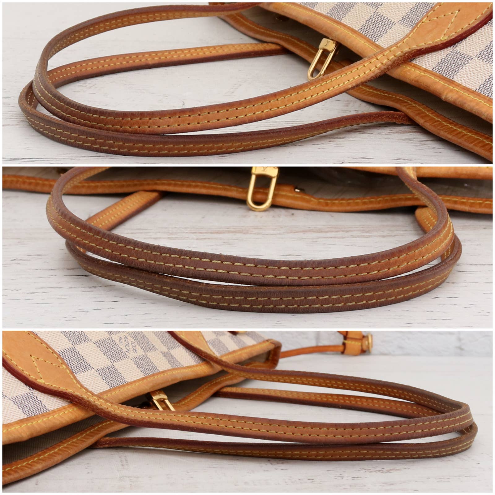 Vachetta (handles & trim): Overall tanning with areas of darkening, scuffing and water spots