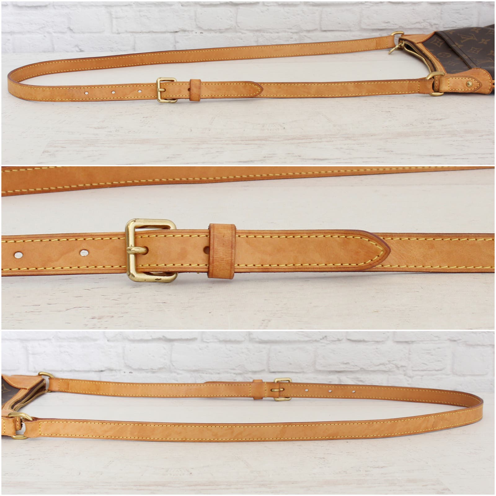 Vachetta (handles & trim): Overall tanning with few areas of darkening, wrinkling, water spots and light scuffing. Few areas of light dirtiness on strap. Light rubbing on corners