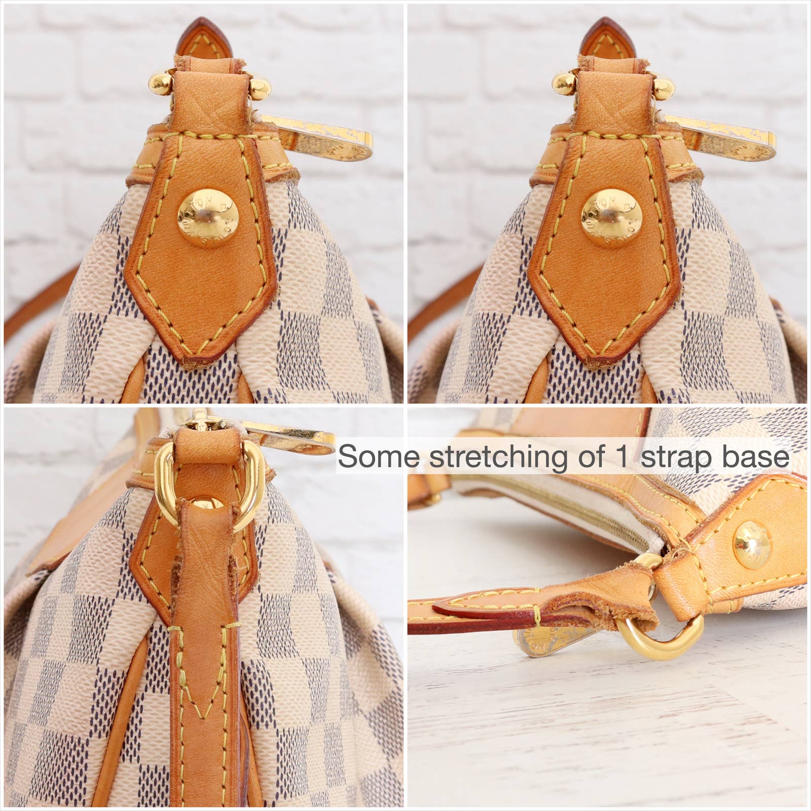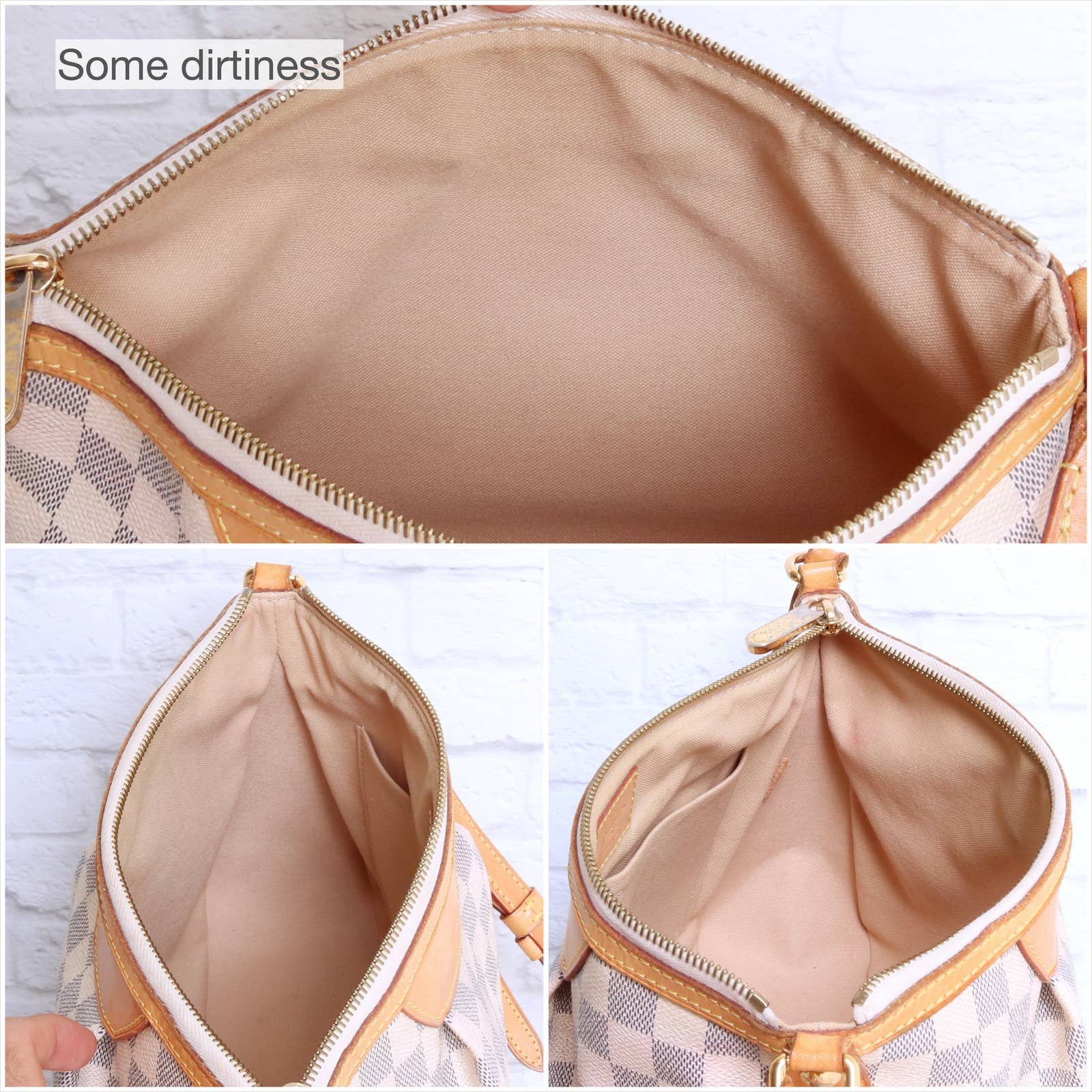 Vachetta (handles & trim): Light tanning overall with some stains/marks. One handle loop where strap attaches to bag has some stretching/tearing