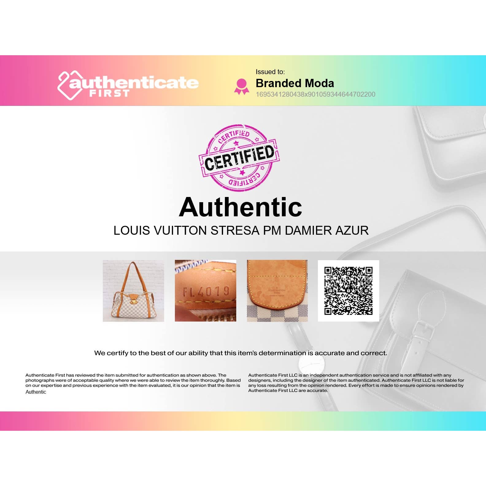 100% Authentic backed with our money back guarantee. Includes authentication by AuthenticateFirst, the leading Louis Vuitton authenticator (please see second image for Certificate of Authenticity and scan QR code to view authentication).