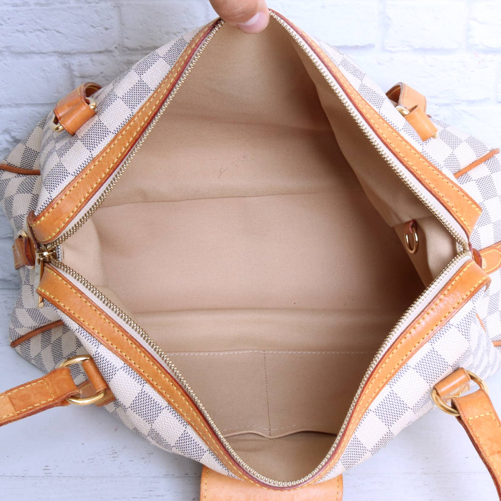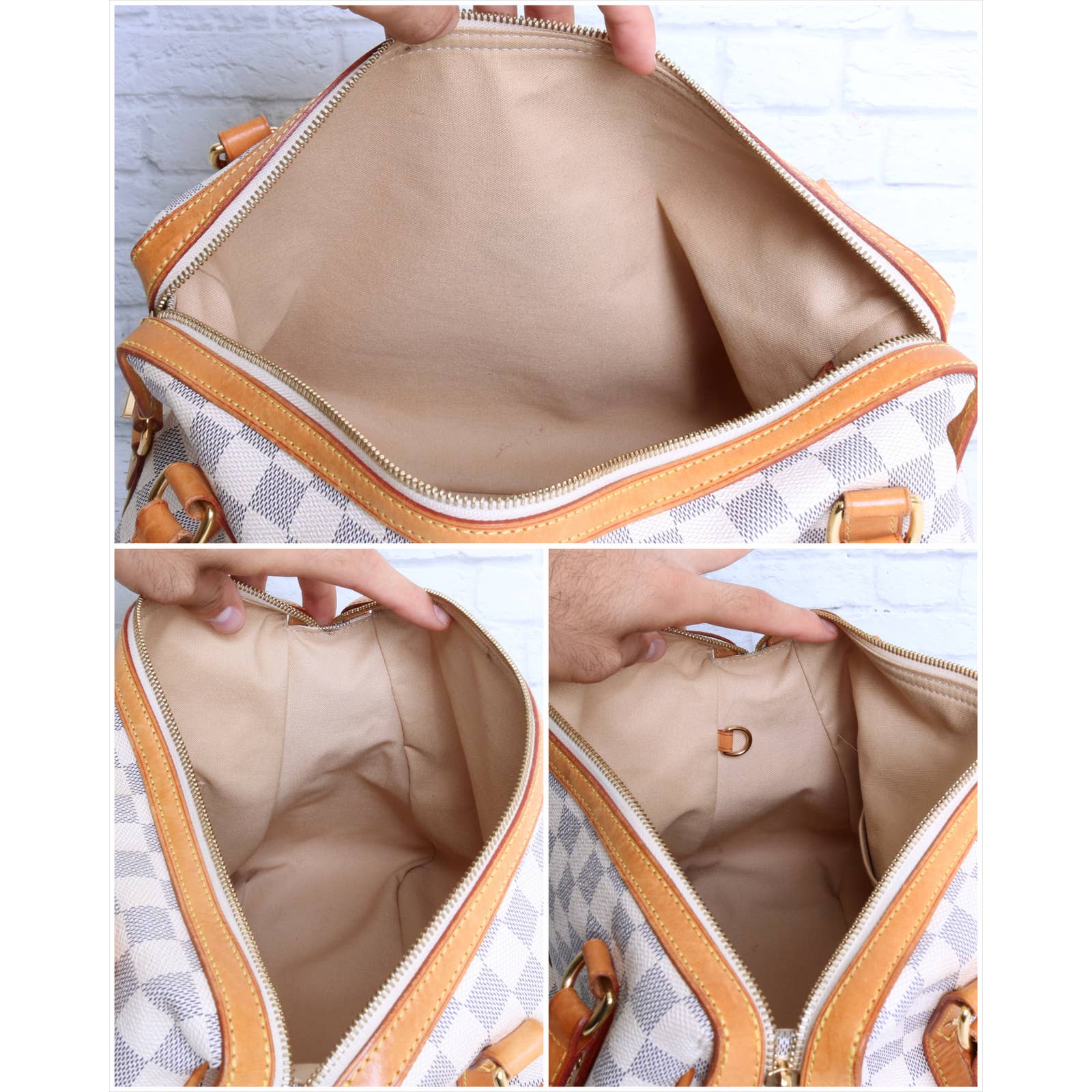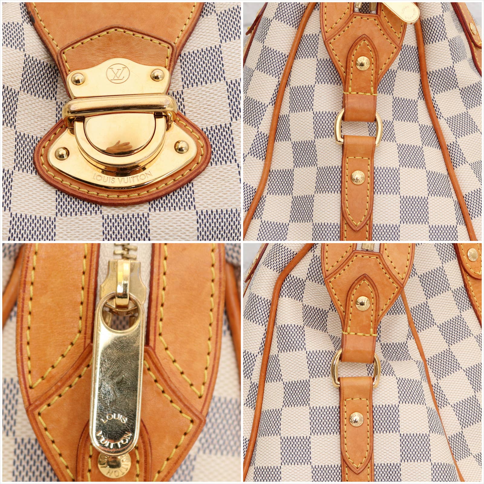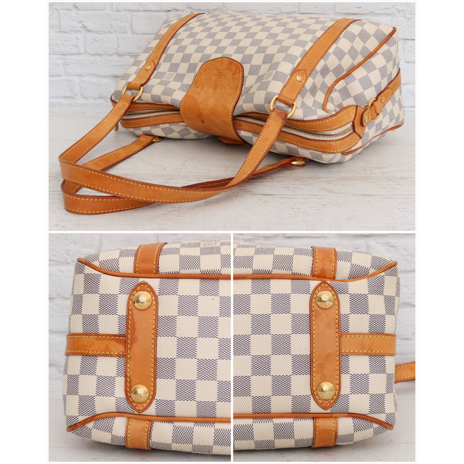 Vachetta (handles & trim): Honey patina in overall good condition. Many water stains on the leather and a few darker stains. Light rubbing along the edges.